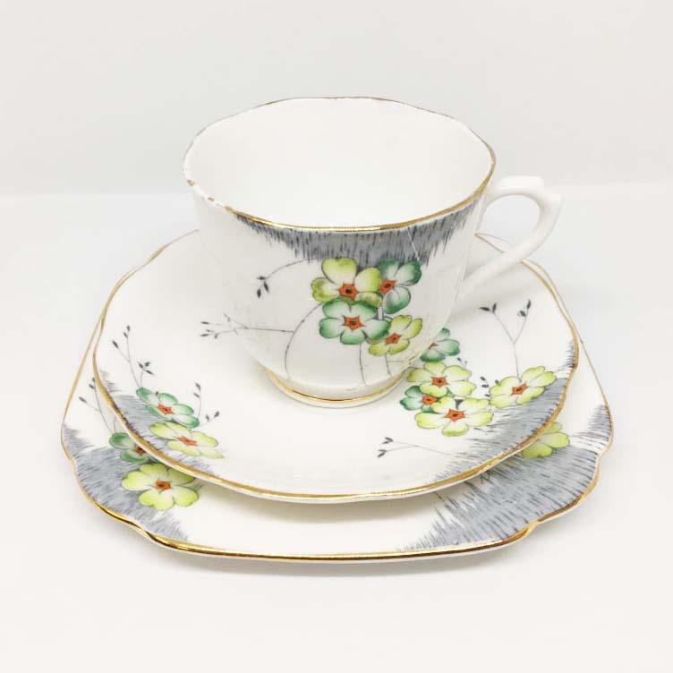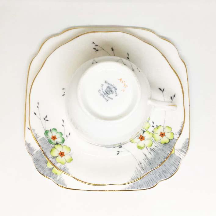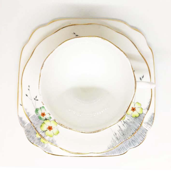 English Royal Albert Crown China with gold leaf, scalloped edge detail.