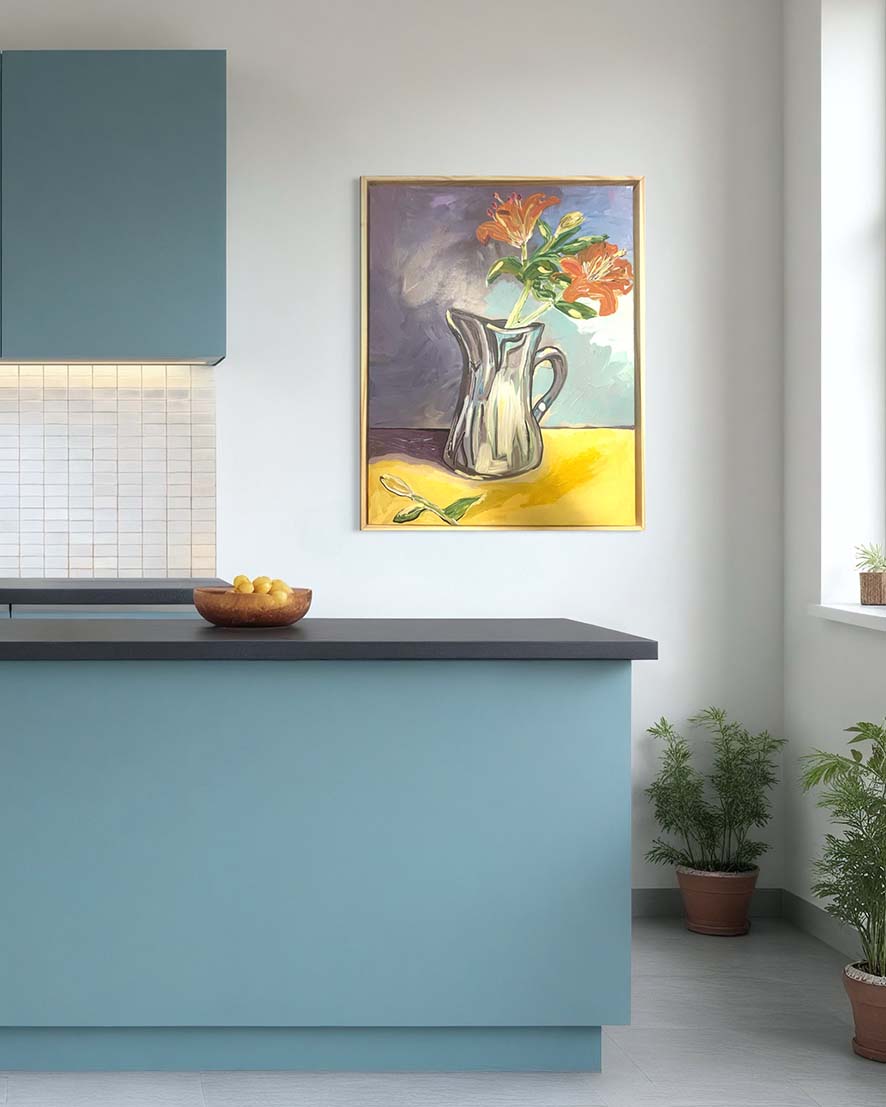 A vibrant still life painting depicting a glass pitcher holding blooming orange flowers, set against a dynamic background of purples, blues, and yellows. The composition has a lively and modern feel, while the overall arrangement maintains a classic elegance