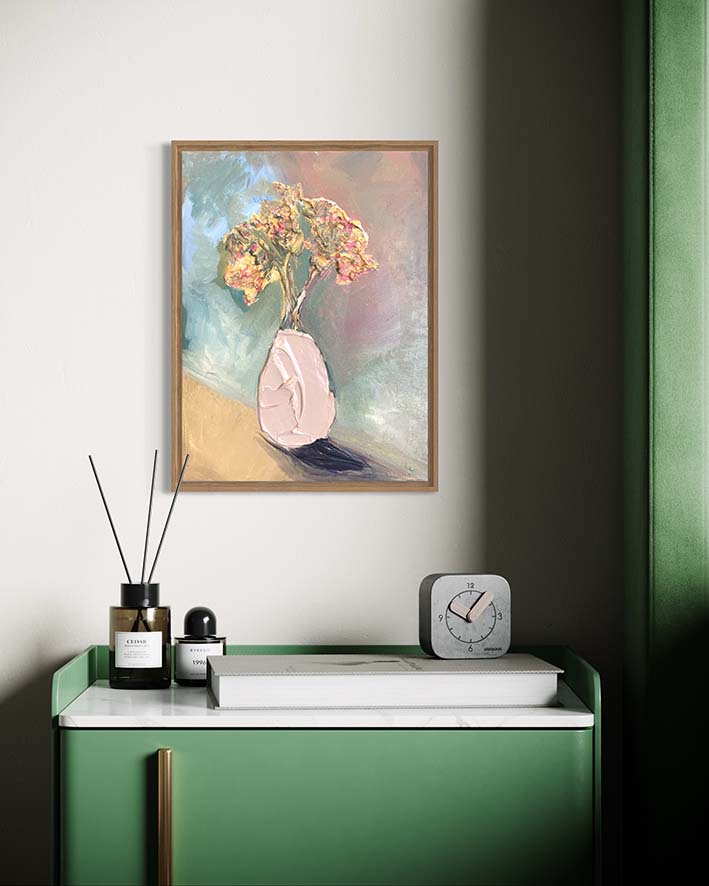 A textured, impressionistic painting featuring a pale pink vase and stunning floral arrangement. A dreamy and delicate artwork