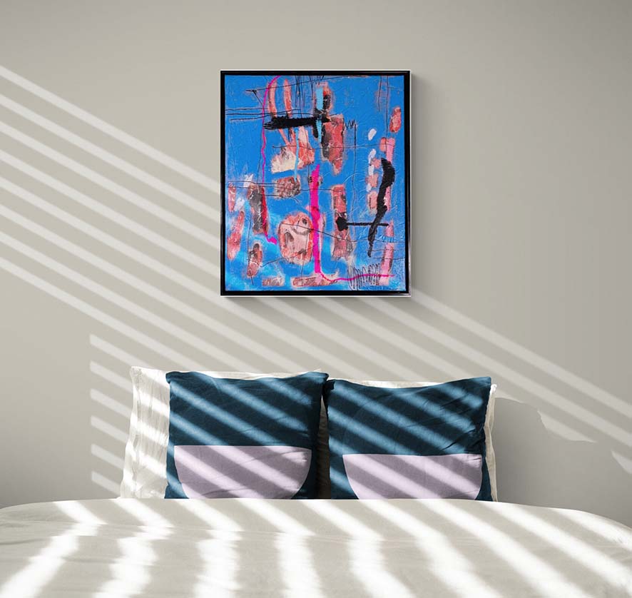 A vibrant abstract painting characterized by a dominant bright blue background & layered with expressive bold colour brushstrokes