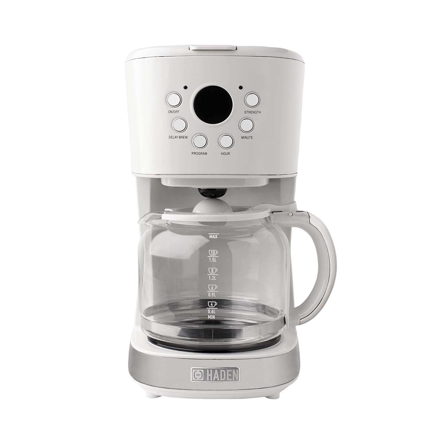 White machine. Features: 12 Cup Capacity, Keep-Warm Function, Glass Carafe (200mm wide x 150mm deep x 165mm high), Sleek and Modern Design