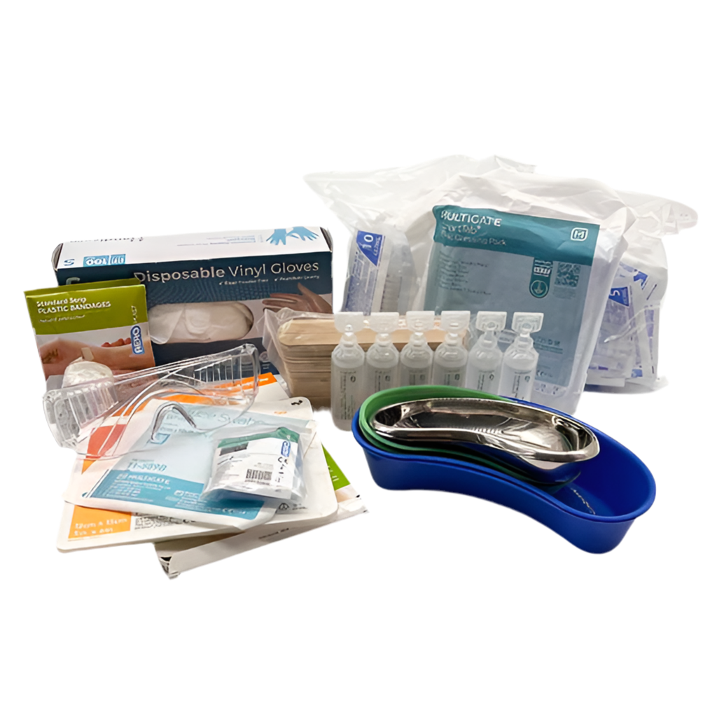 Includes, disposable gloves, bag of 5ml & 10ml needles, bluey, gauze, bandaids, saline solutions, tongue compressor, 6 x kidney dish (stainless, green & blue - 2 of each)
