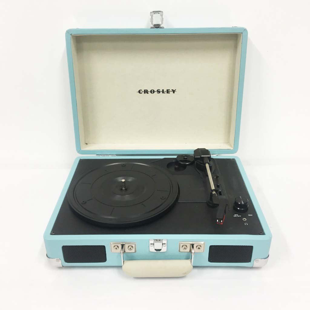 Crosley portable record player in baby blue.