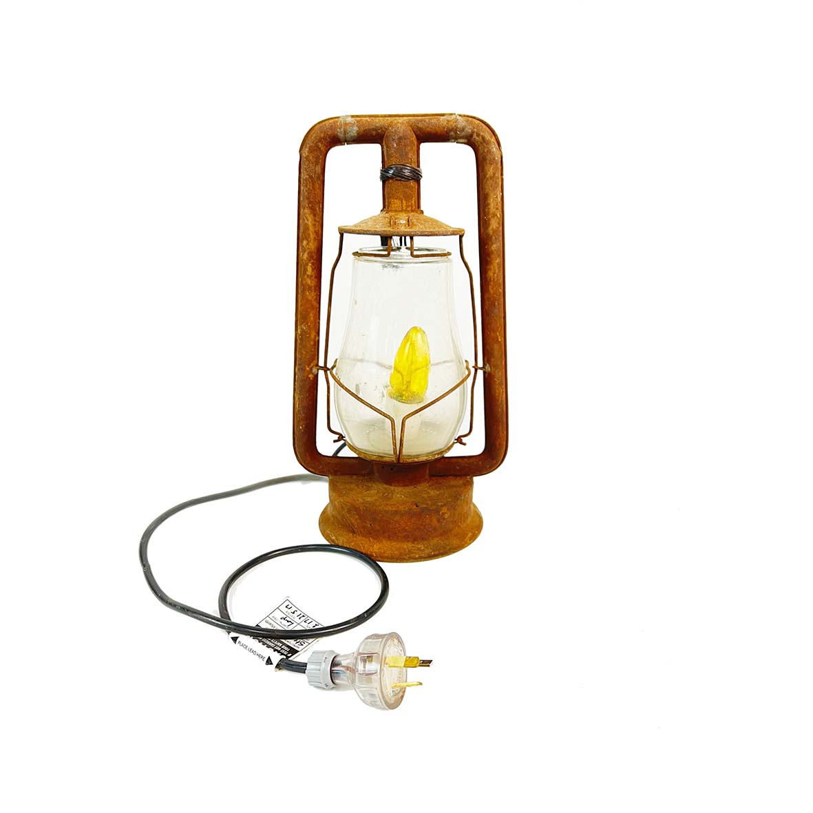 Rounded edges, rust styled lantern with power cord