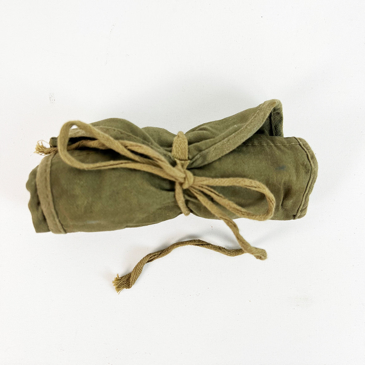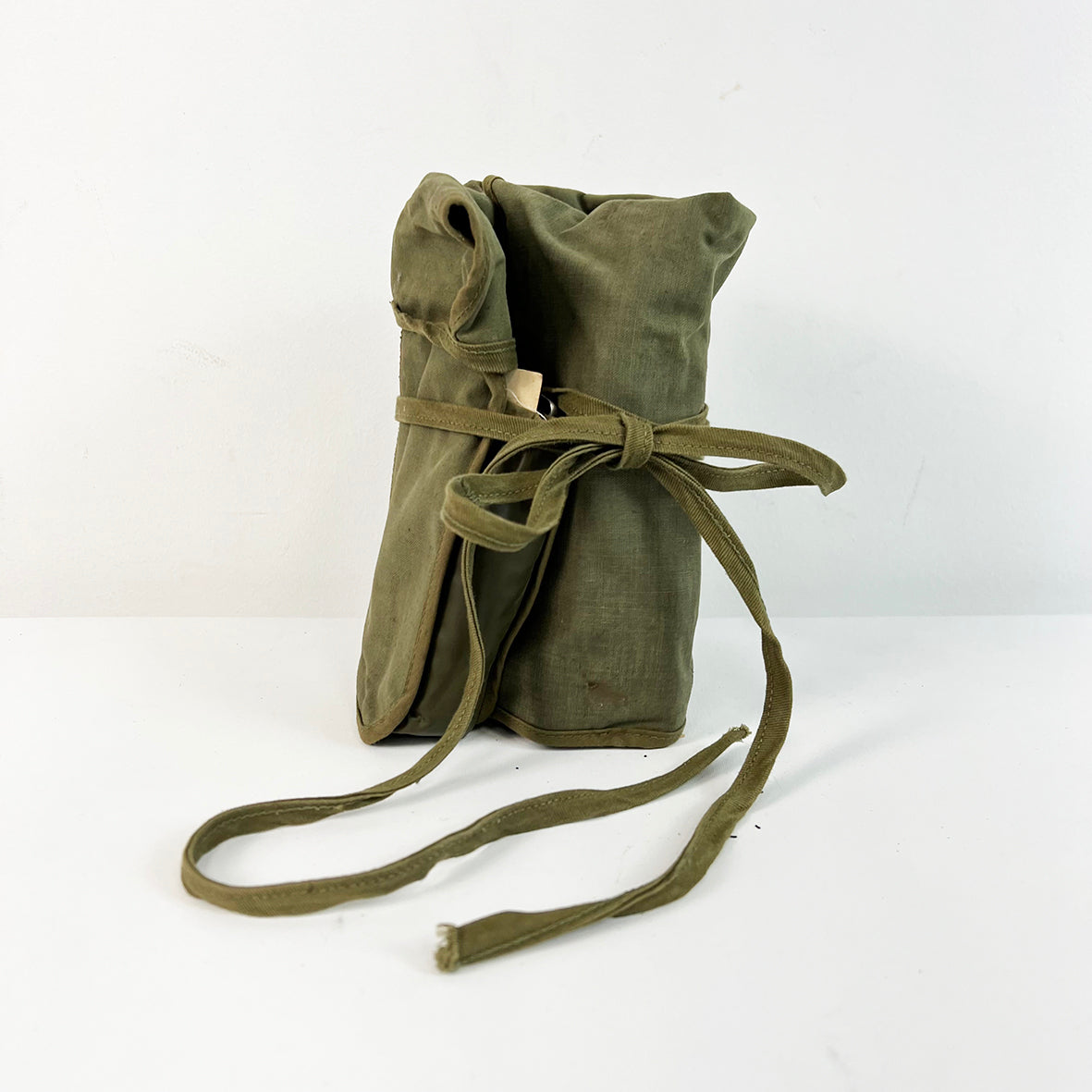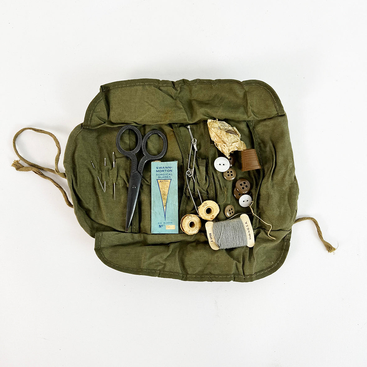 Includes - 3 mini spools of thread, 1 x 5 yard spool, buttons, surgical blades, thread scissors, needles, thimble in an army green canvas roll up kit