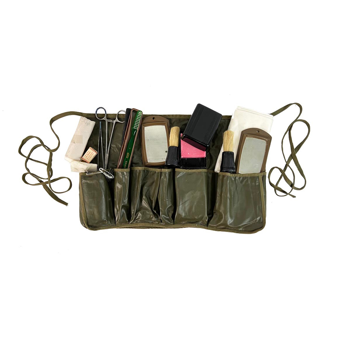 In an army green plastic roll. Includes 2 x hand mirror, shaving brushes, soap box & soap, toothbrush holder & toothbrush, safety pins, bandages & gauze ,wound wash, tweezers & wound scissors
