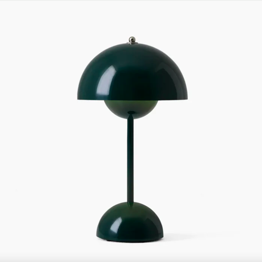 A lightweight, cordless table lamp designed by Verner Panton, featuring a rechargeable battery and USB charging for easy placement anywhere