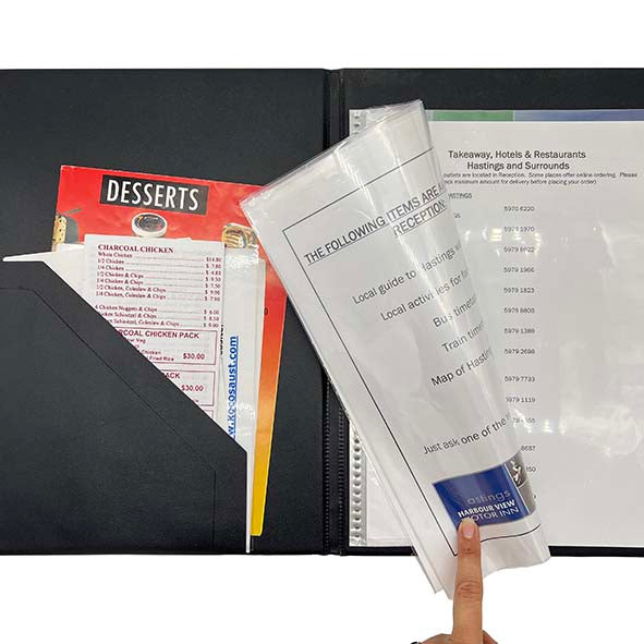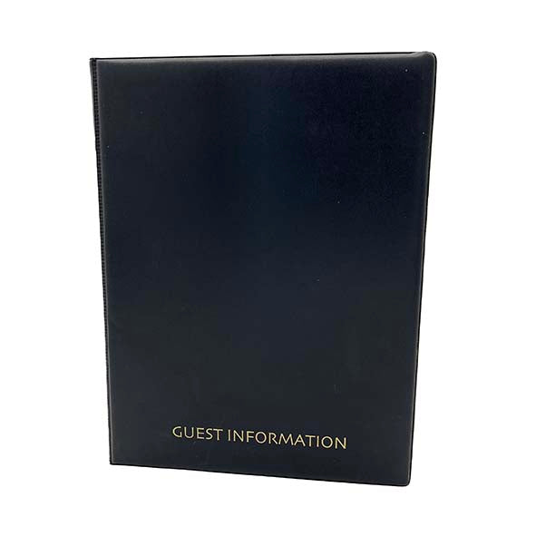 Black leather look hotel guest information booklet