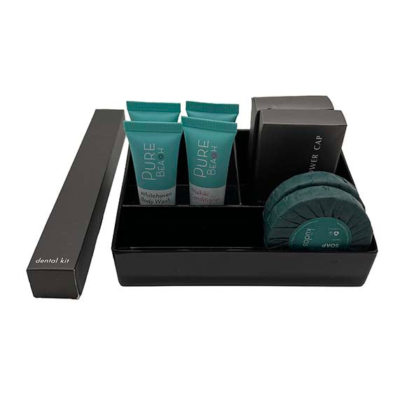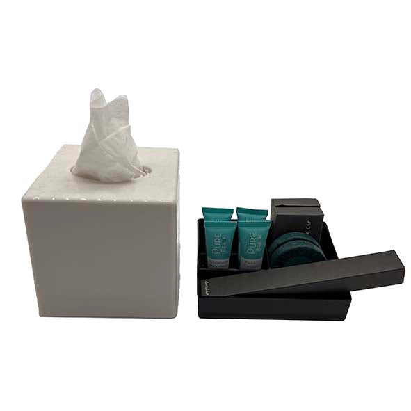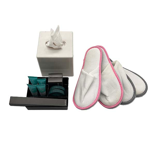 Includes, tissues cover & box, 2 x slippers, set of body wash, shampoo conditioner, moisturizer, soap, shower cap & dental kit + holder