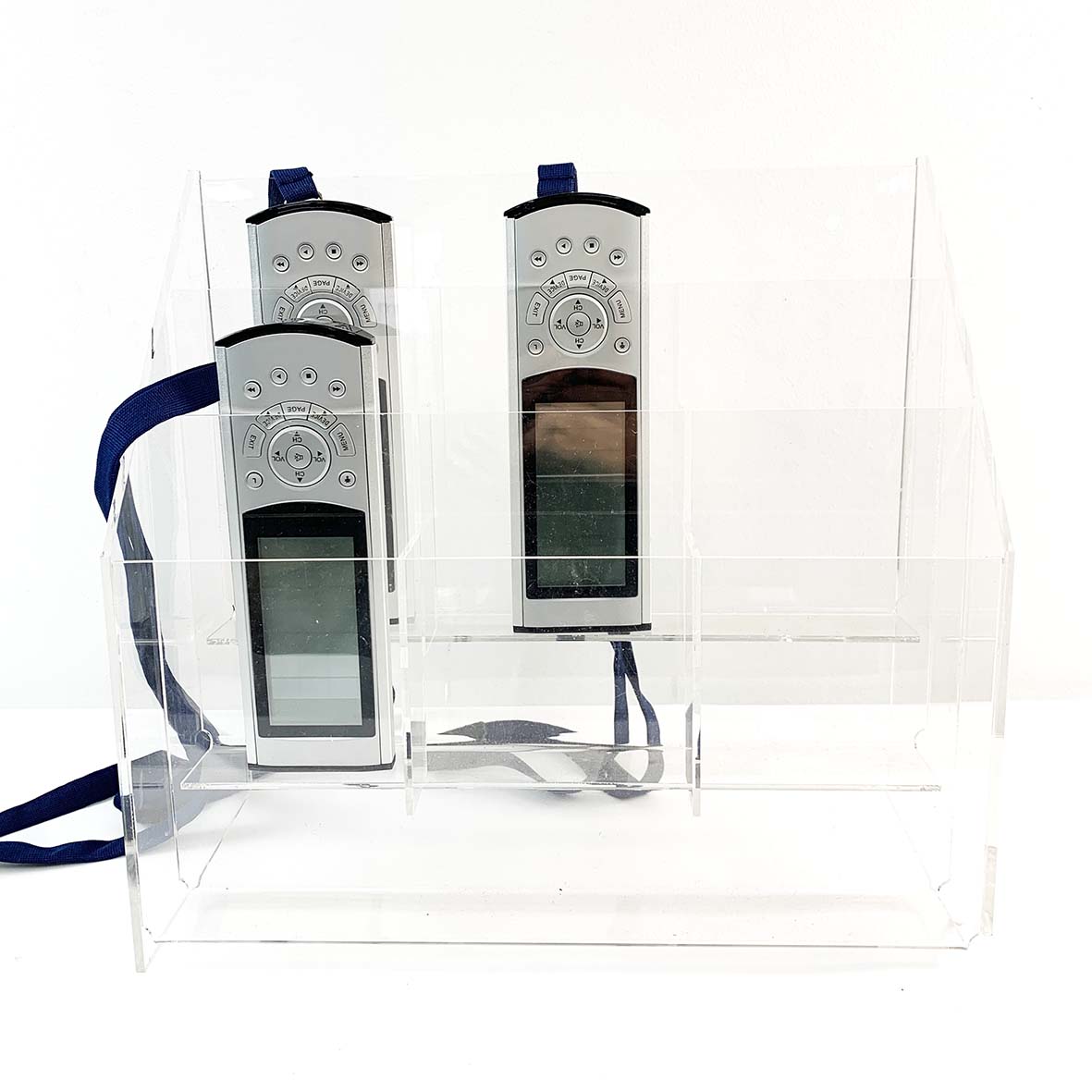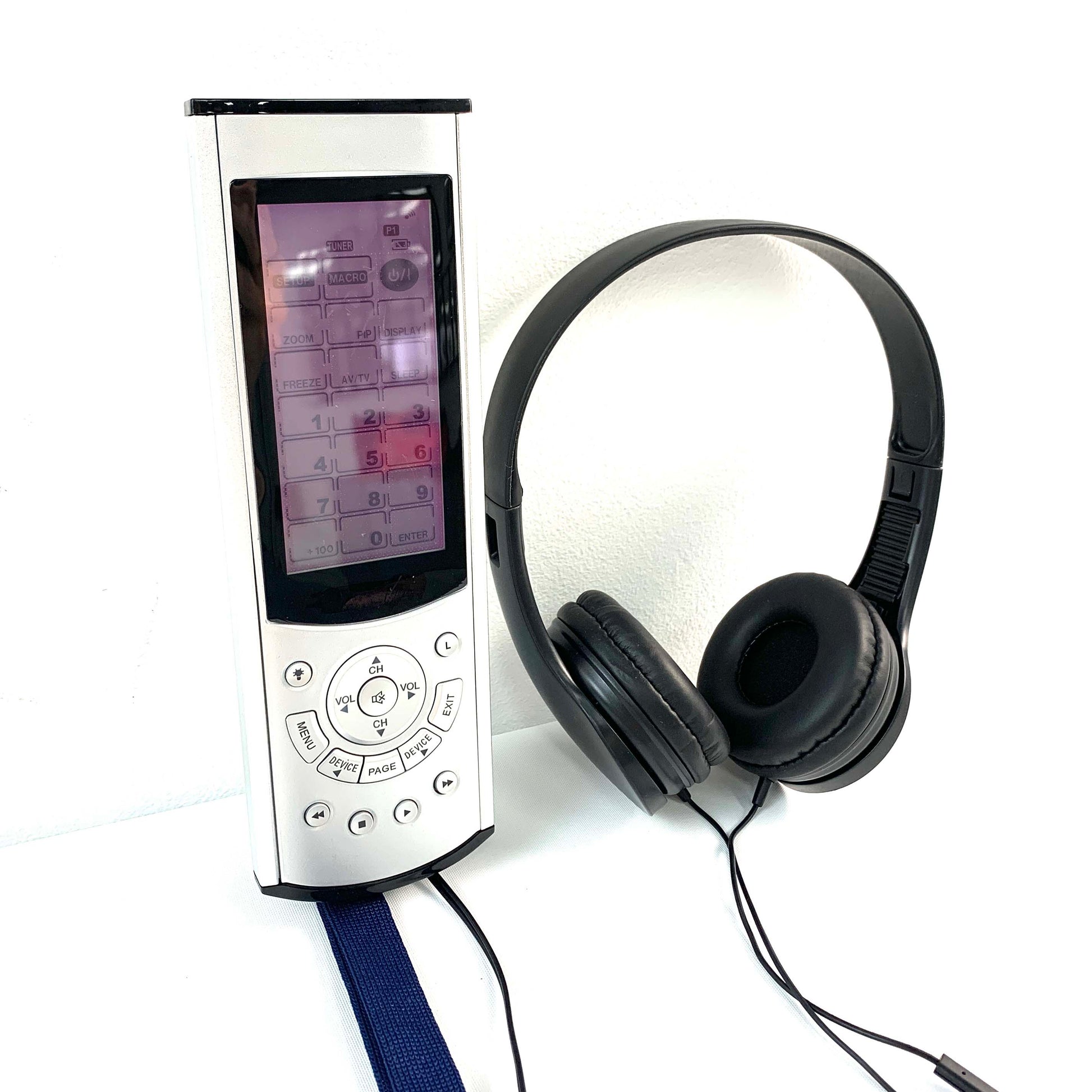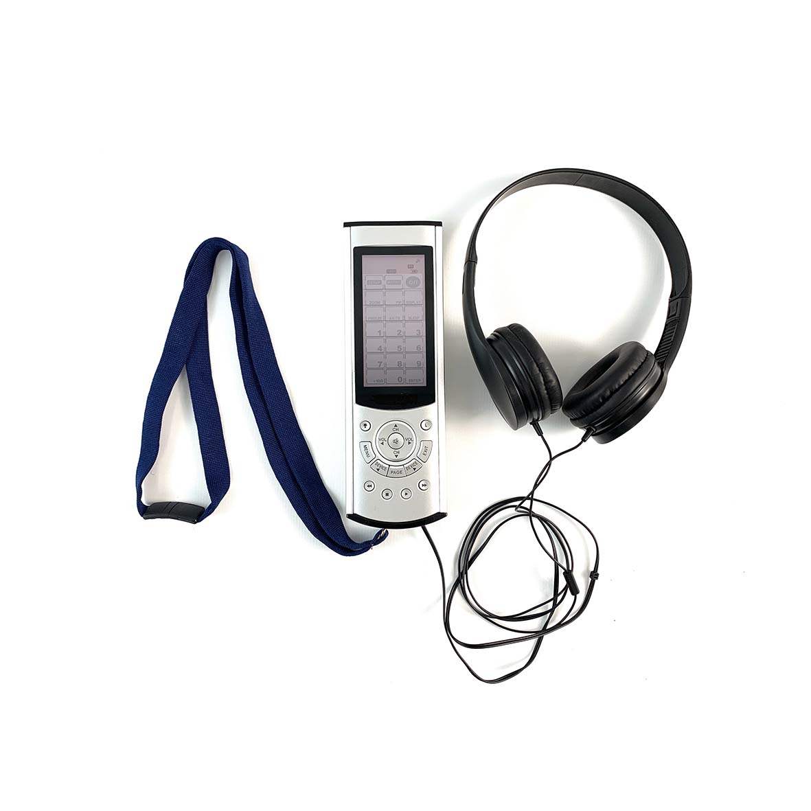 Museum audio guide in silver & overhead headphones in black with navy blue lanyard