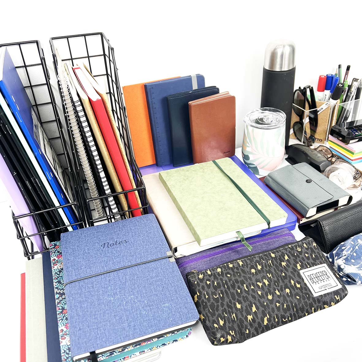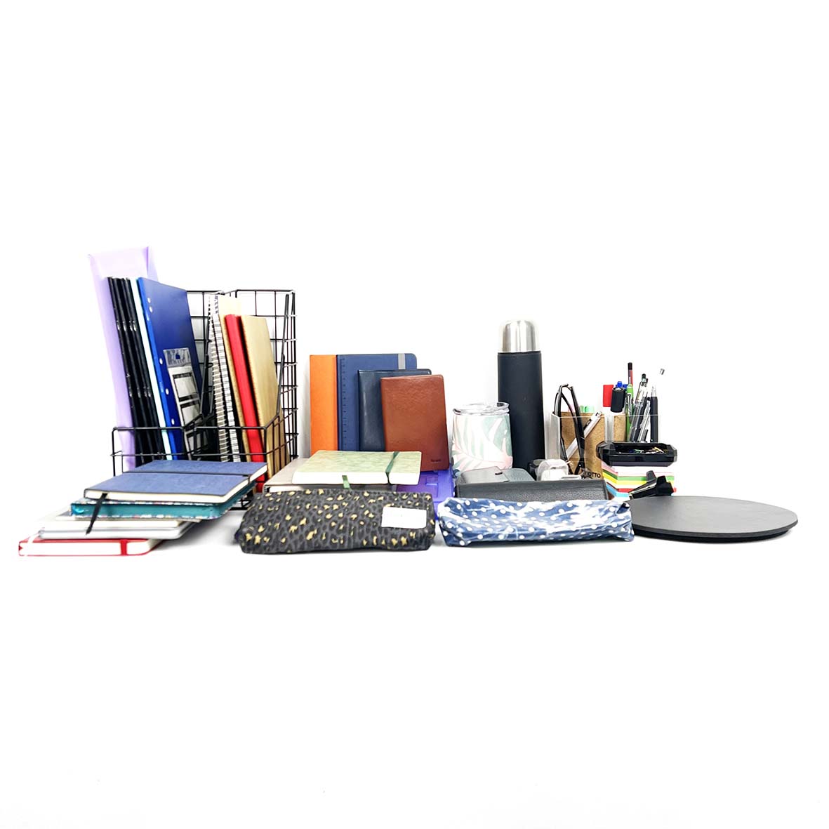 Includes - 6 x A4 exercise books, 2 x wire magazine files, 2 x document wallets, 1 x petty cash book, 3 x medium notebooks,1 x spiral notebook, 8 x a5 notebook, 4 x small notebook, 3 x pencil case, 1 x sunglasses case, 2 x glasses, 1 x stapler, 2 x pen holder & pens, 1 x sticky tape, 3 x mouse pads, 1 x paperclip holder, 1 x staple remover, various post it notes, 1 x drink bottle, 1 x take away coffee cup & small copper tray