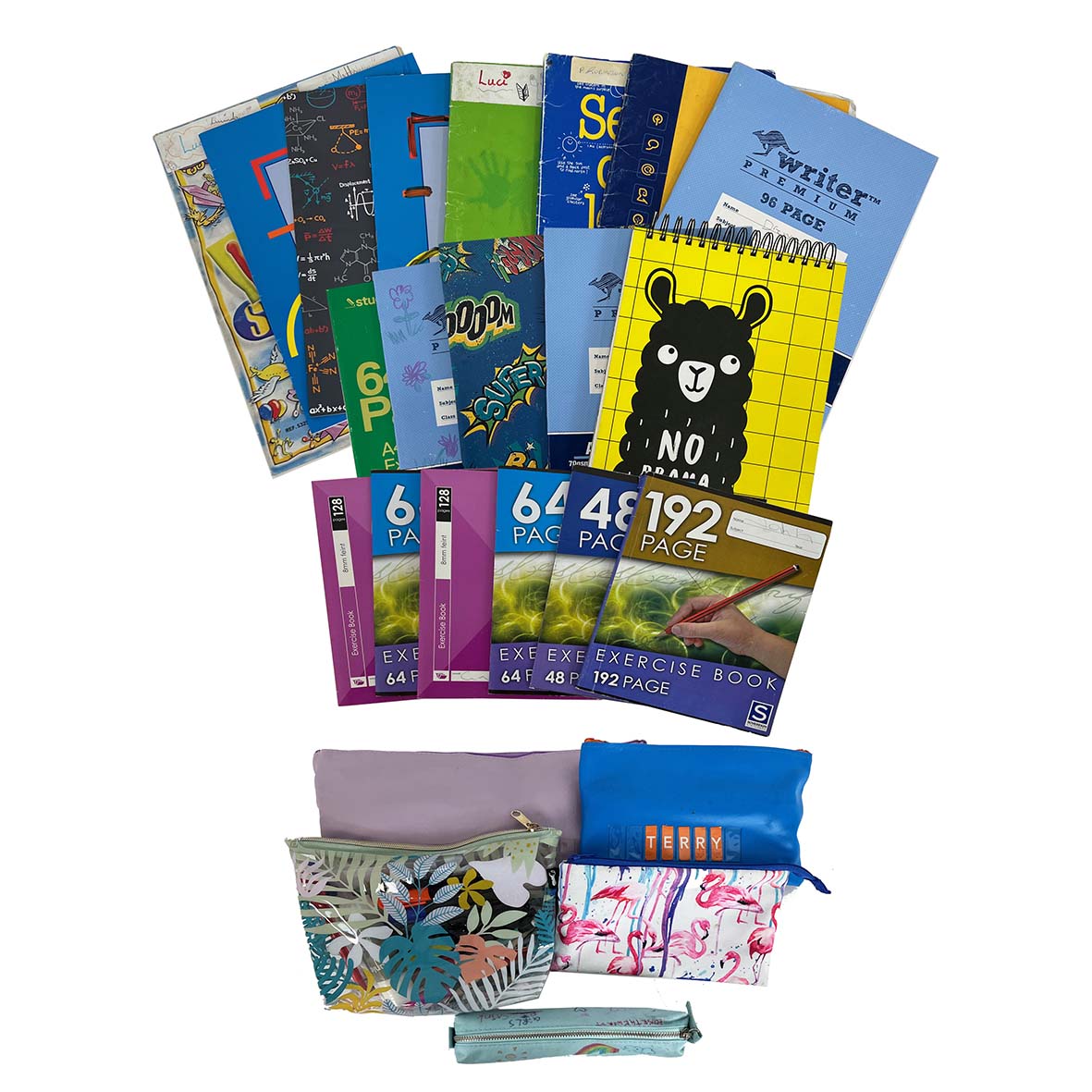 Includes 12 x A4 exercise books, 1 spiral sketchbook, 6 x A5 exercise, 5 x pencil case as pictured