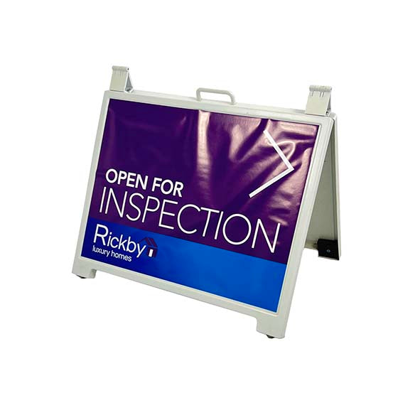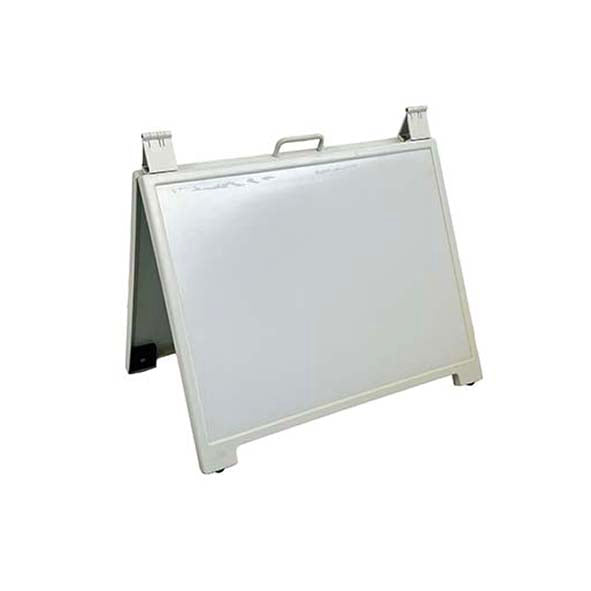 This dual sided A frame has a recessed area to place advertising graphics one each side. This area is meant for signs that are 580mm x 430mm. Features rubber feet