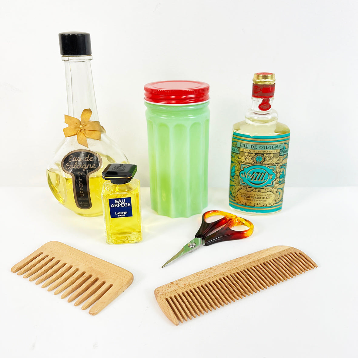 Set of 7 includes scissors, 2 x combs, 3 x cologne & 1 x bathroom jar