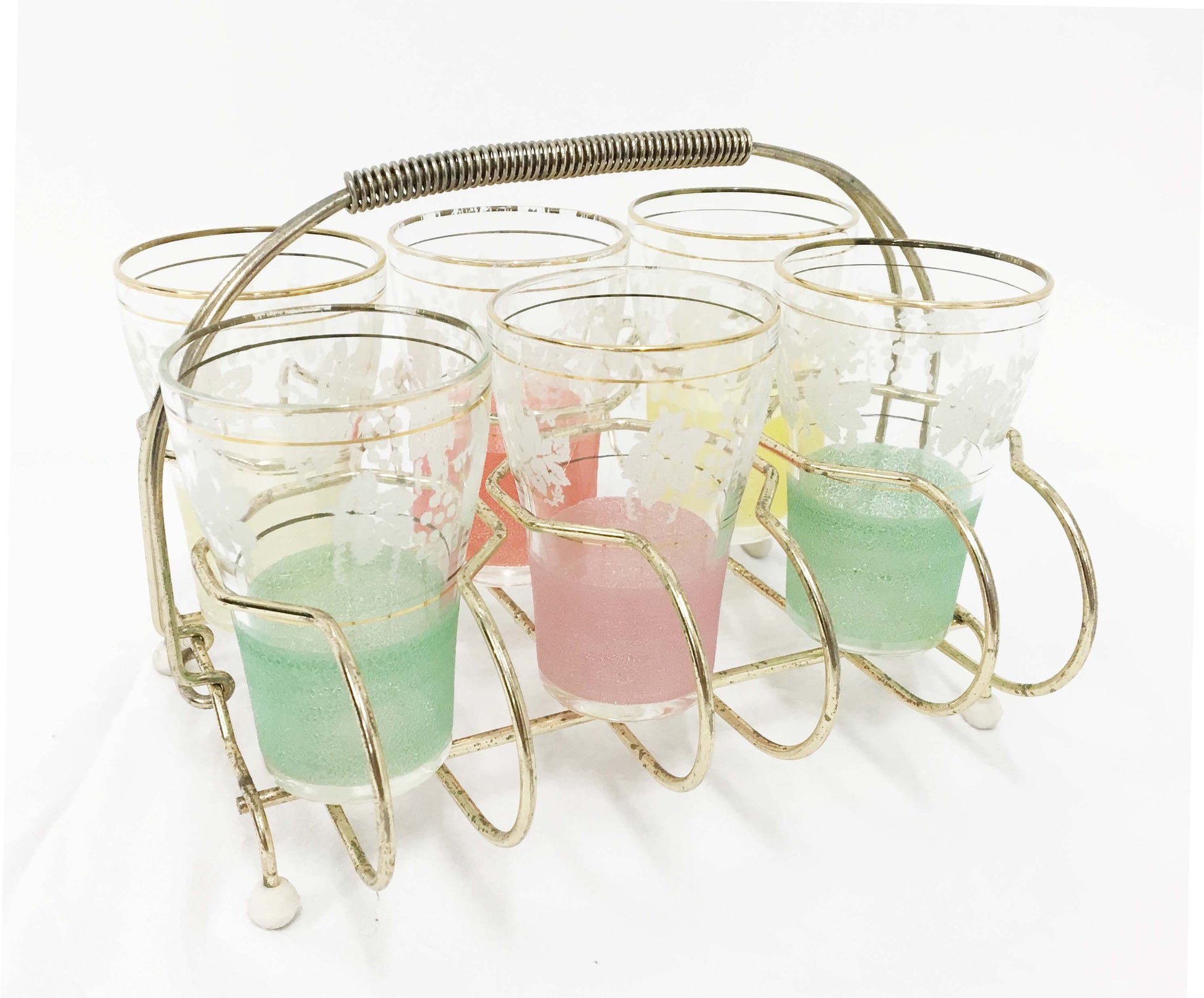 Gold Metal Vintage Drink Caddy with Multi Coloured Decorative Vintage Glasses