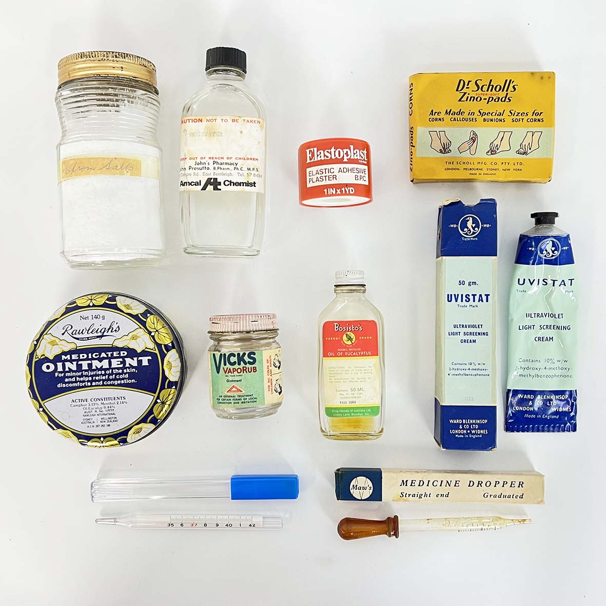 Includes 14 Items - Ultraviolet light screening cream, medical dropper, thermometer, eucalyptus oil, vicks vapor rub, elastoplast, medicated ointment, epsom salt, rose water, foot corn pads & bandage