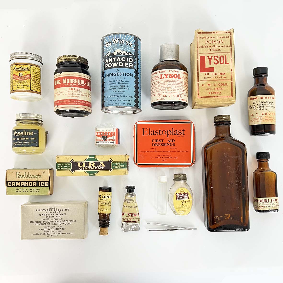 Includes 20 items- Amber liquid bottle, inhalation medication, eye drops, prescription medication, ointment x2 camphor ice, antacid, bandage, vaseline, cod liver oil, first aid dressing, elastoplast, mustard ointment, aspirin, glass vial, tweezers, lysol & bandage