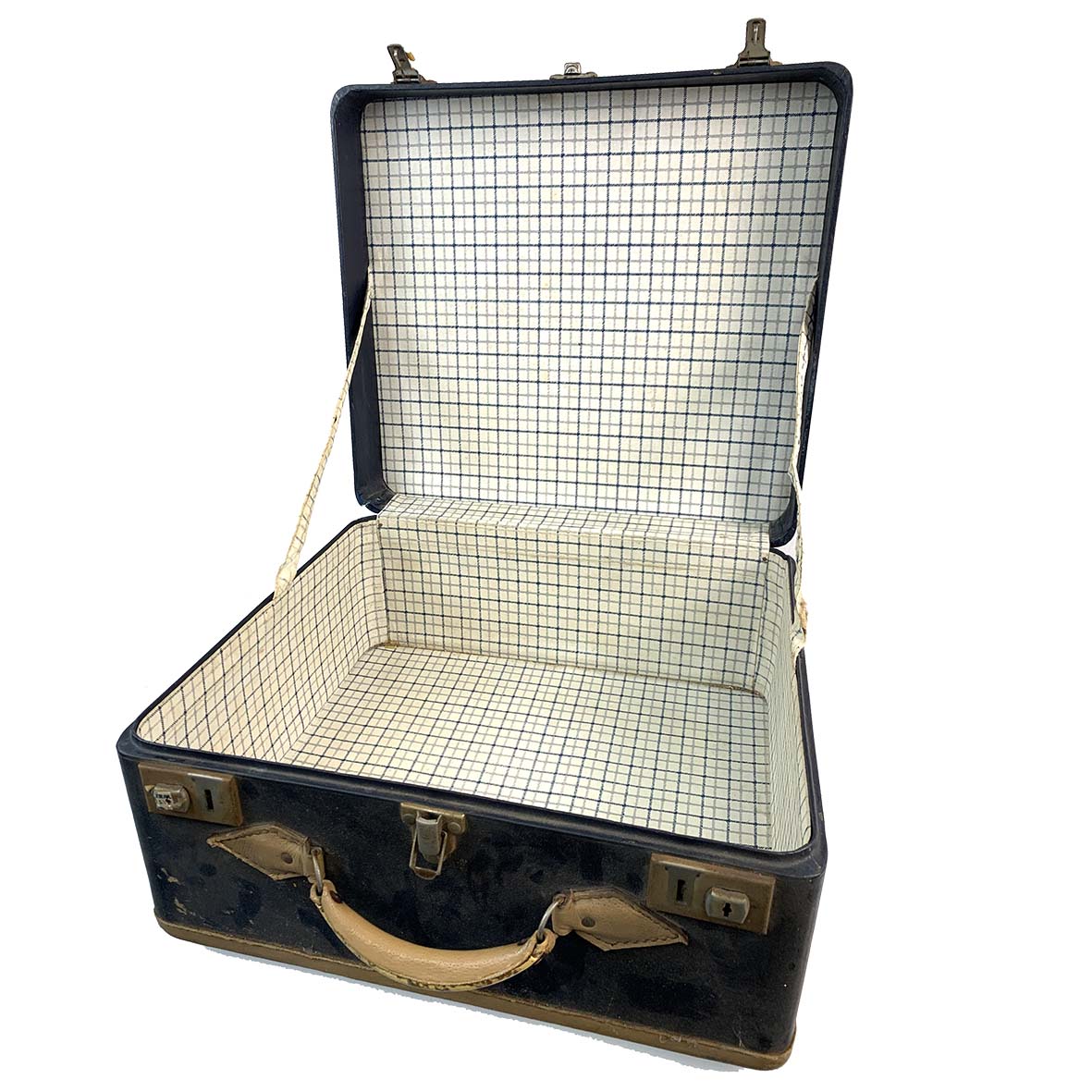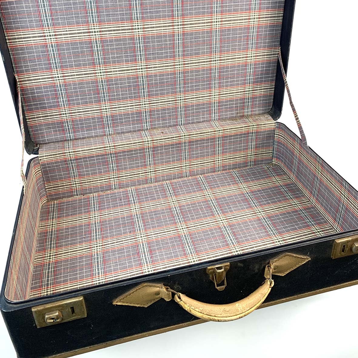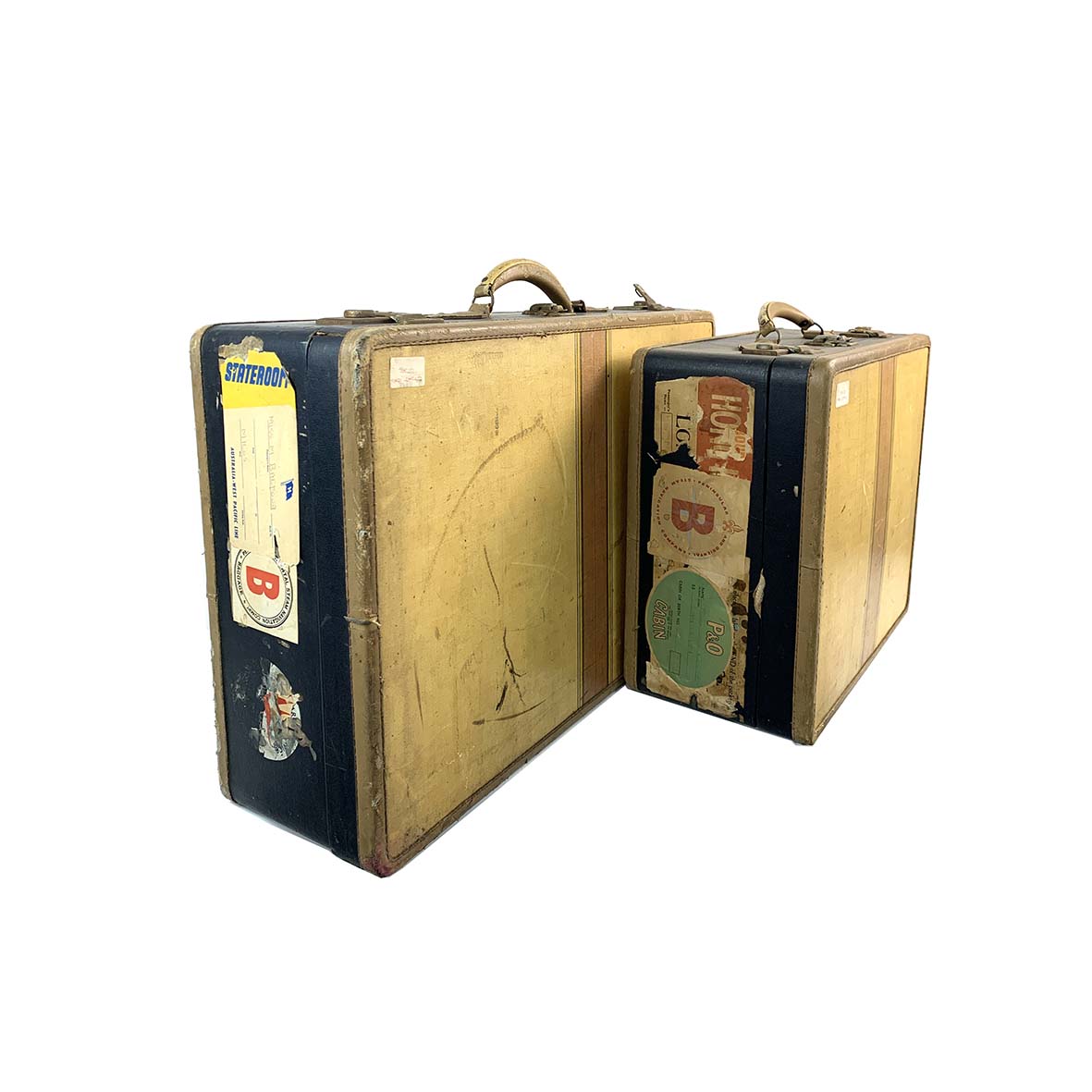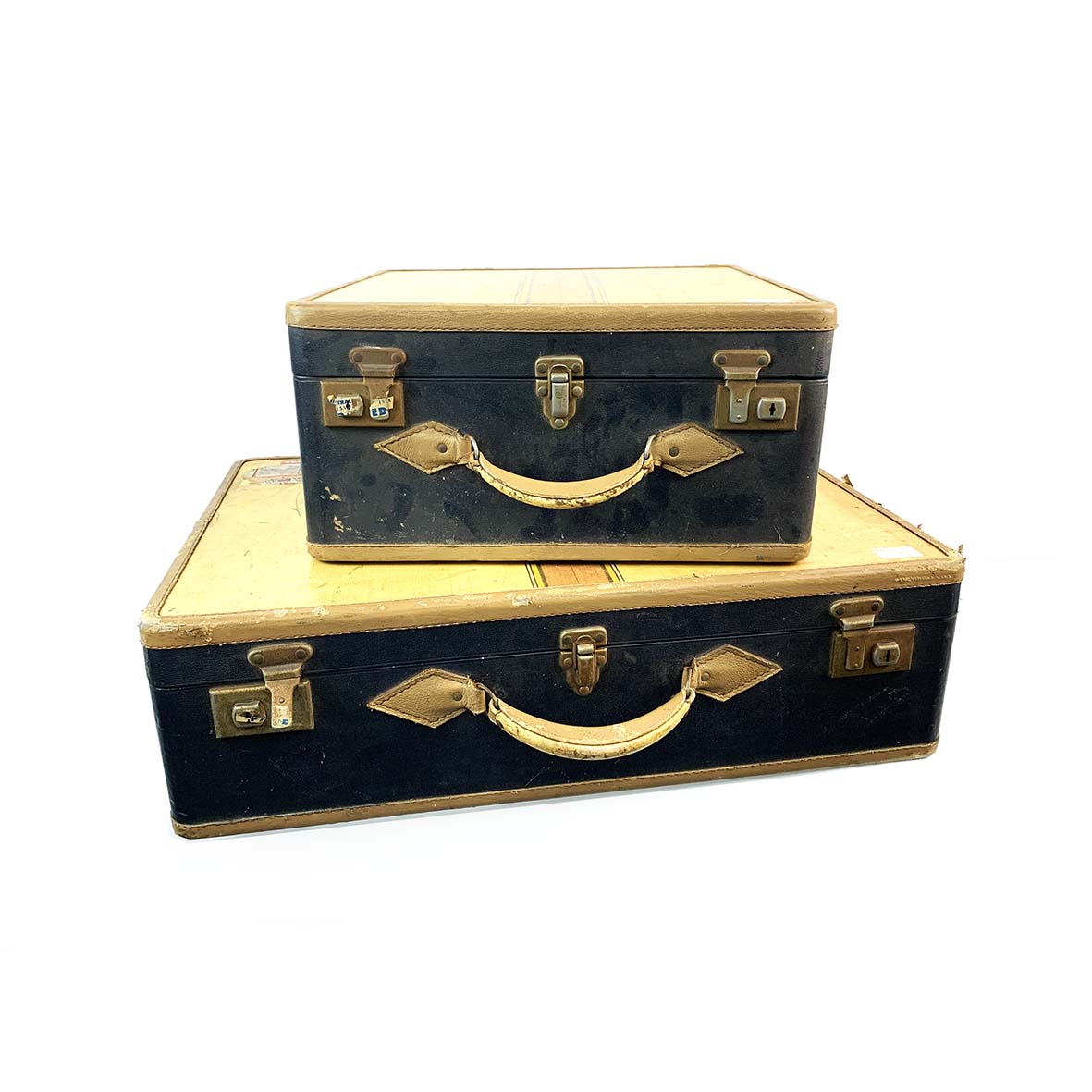1950's/ 60's suitcase set in caramel/ mustard with brown & black stripe and leather detail. Features original luggage stickers