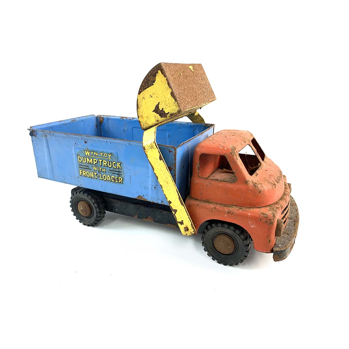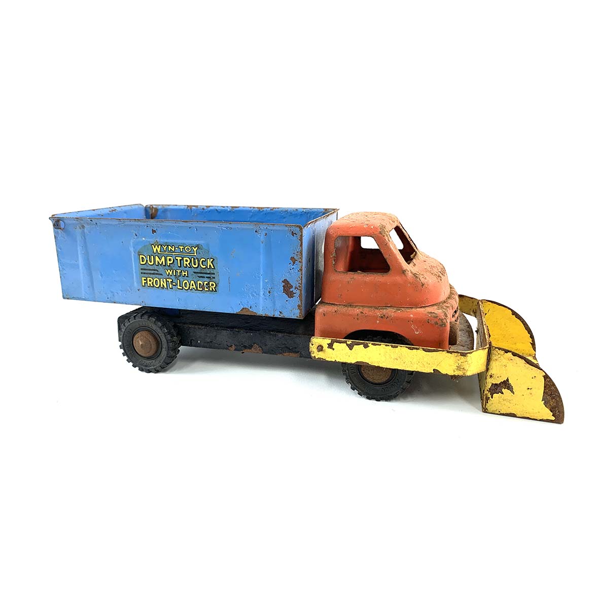 Vintage Toy Dump Truck with front loader in blue, red & yellow
